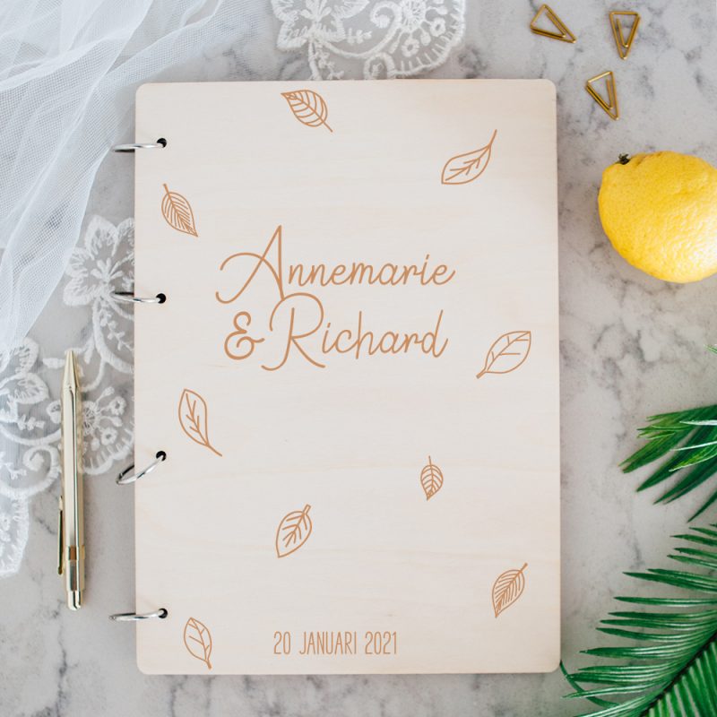 Vieren jullie je bruiloft in botanische stijl? Dan past dit ‘Gastenboek Hout Leaves’ daar perfect bij!