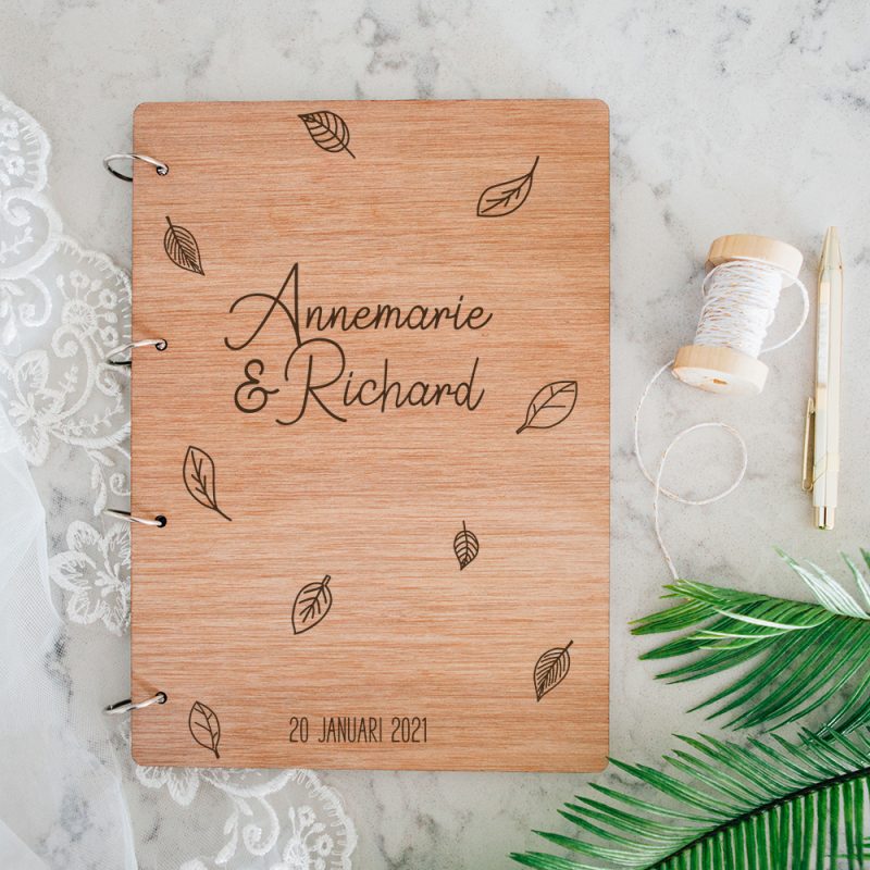 Bij dit gastenboek worden jullie namen en trouwdatum samen met de bladeren gegraveerd in het hout.