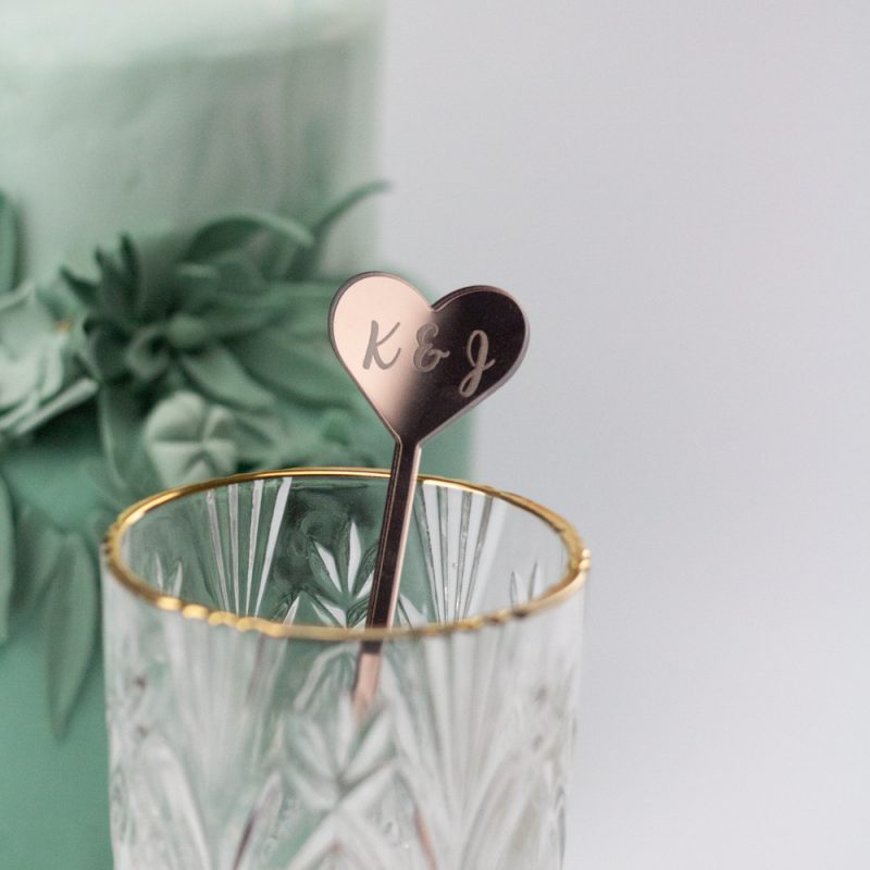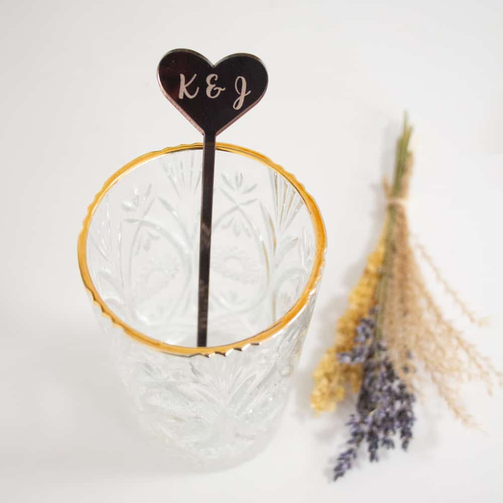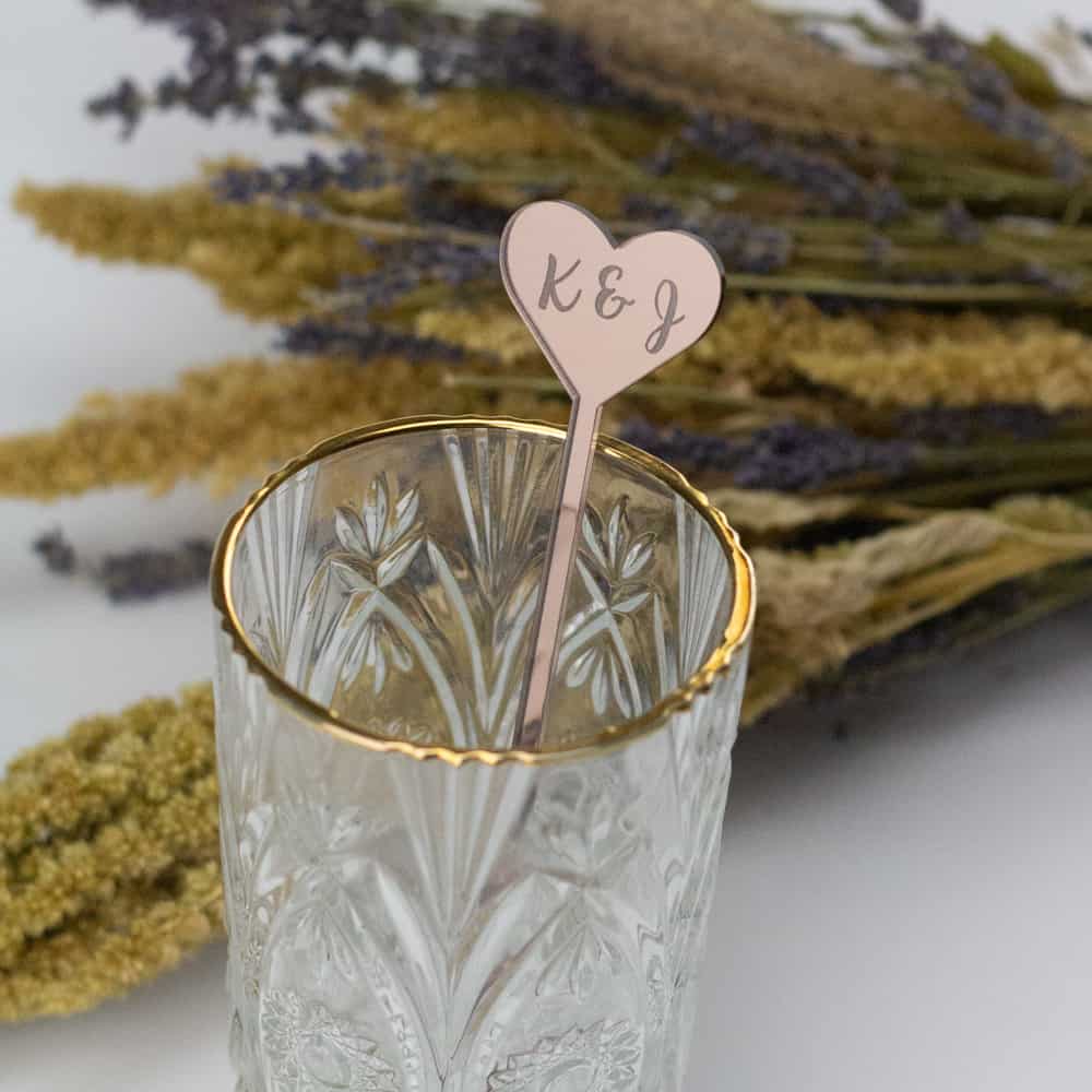 Versier de dinertafel en/of de cocktails met deze roerstaafjes met jullie nieuwe initialen gegraveerd in een hart.