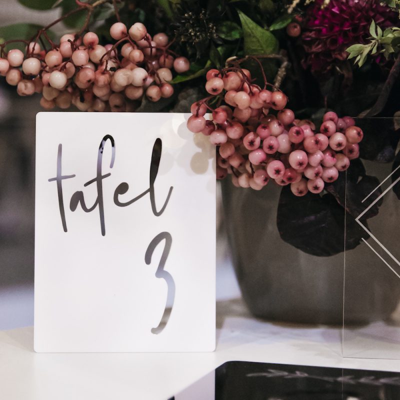 De tafelnummers zijn 13 x 10 cm. Verkrijgbaar in 3 mm transparant, wit of zwart acryl.