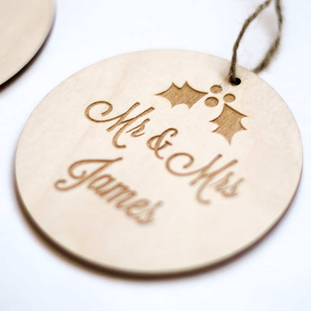 Gepersonaliseerde kerstballen (8,5 cm) met mistletoe van hout of acryl. Speciaal voor jou gemaakt!