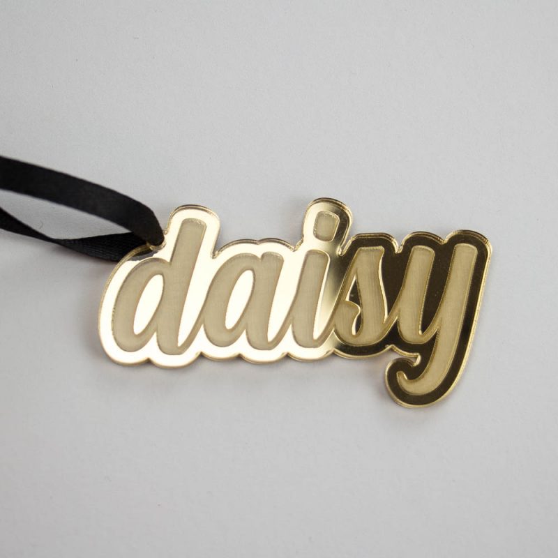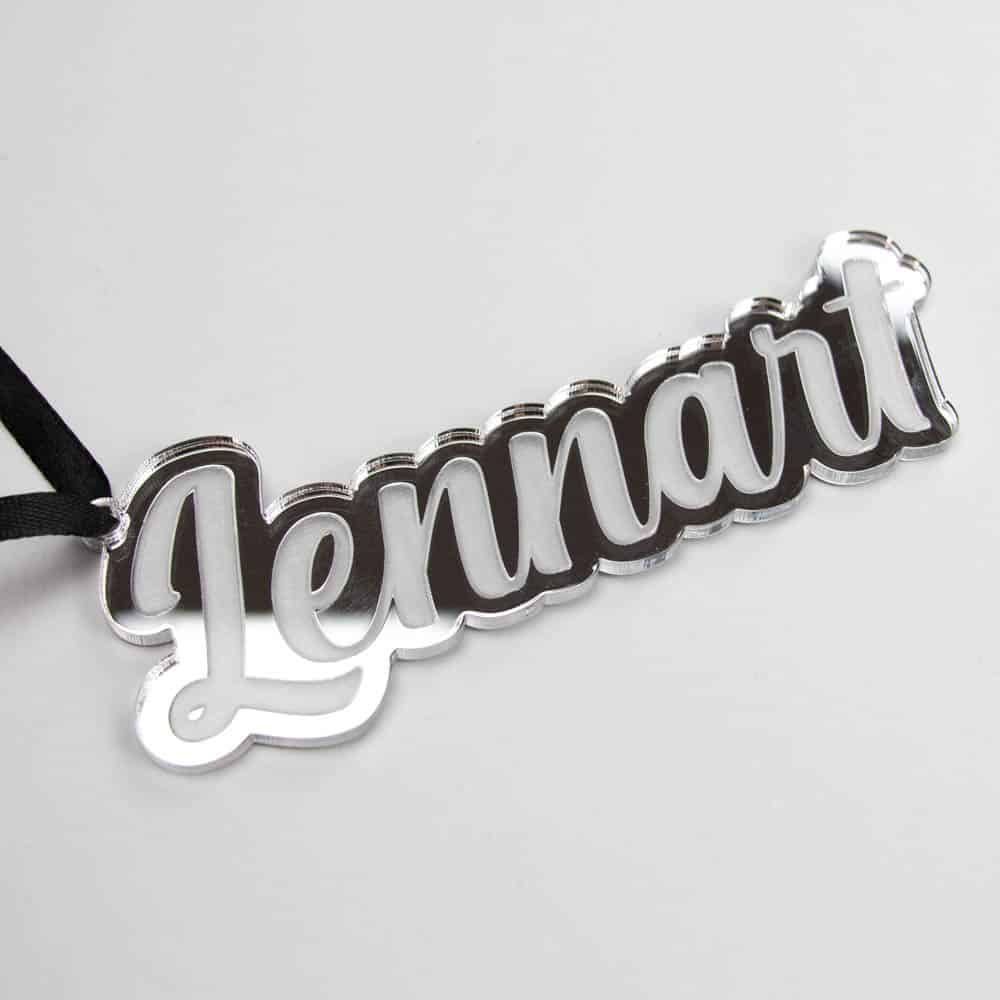 Elke naam (8-12 cm in lengte) wordt met bijpassend lint of touw geleverd, deze zijn echter makkelijk zelf te vervangen door een andere lint of touw in een kleur naar wens.
