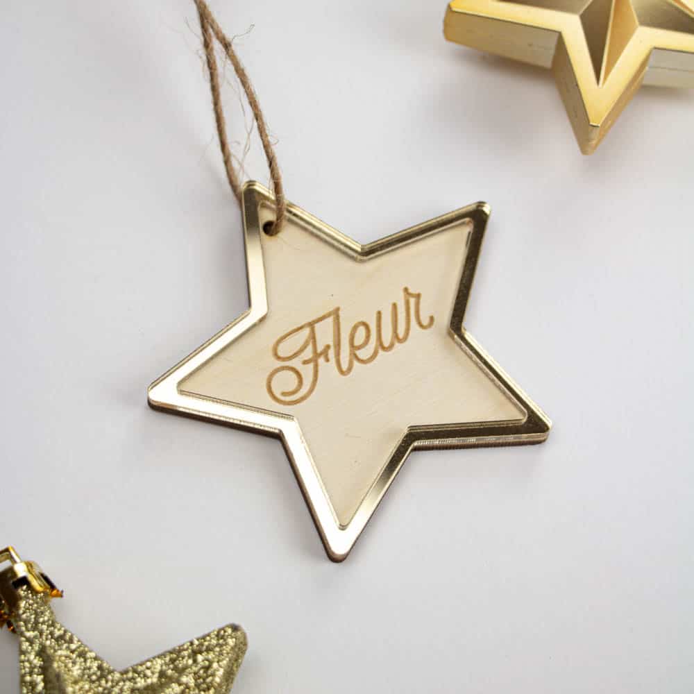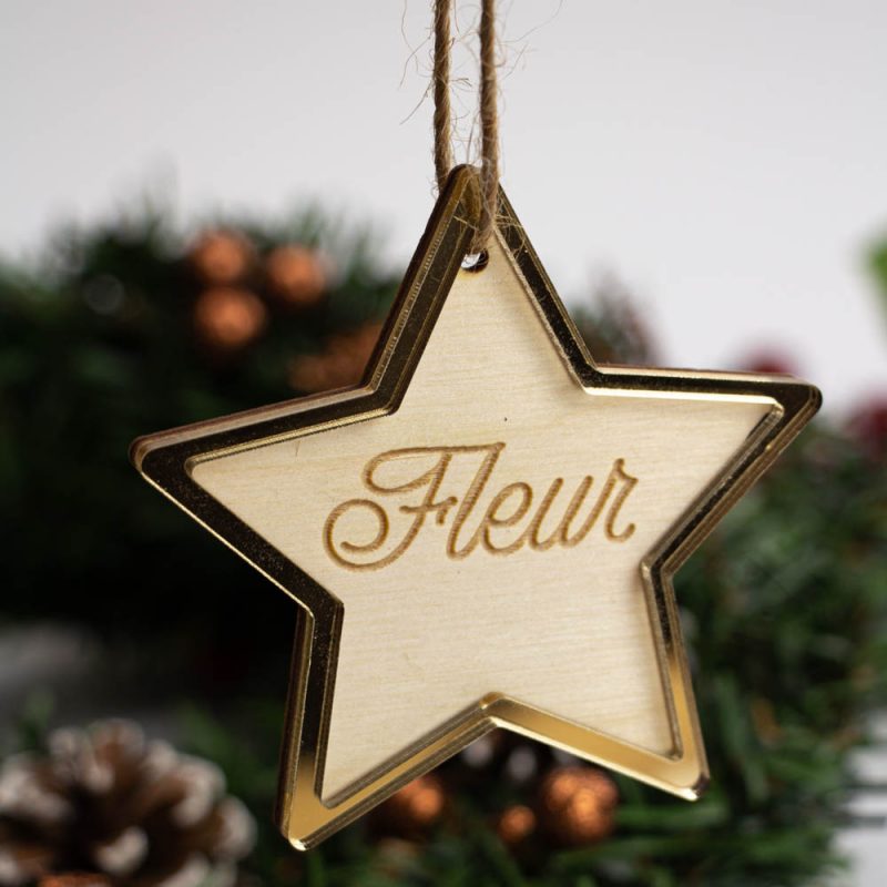 De onderlaag is berkenhout waarin we de naam en evt. extra tekst graveren. De bovenste laag (de ster) is van acryl en daarbij kan uit verschillende kleuren gekozen worden.