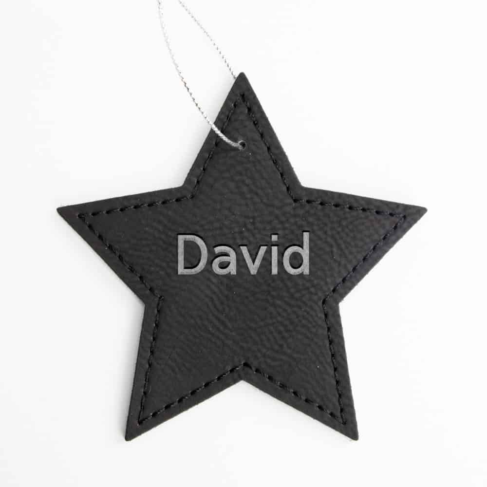 Gepersonaliseerde kersthanger gemaakt van synthetisch leer dat speciaal ontwikkelt is voor laser graveren.