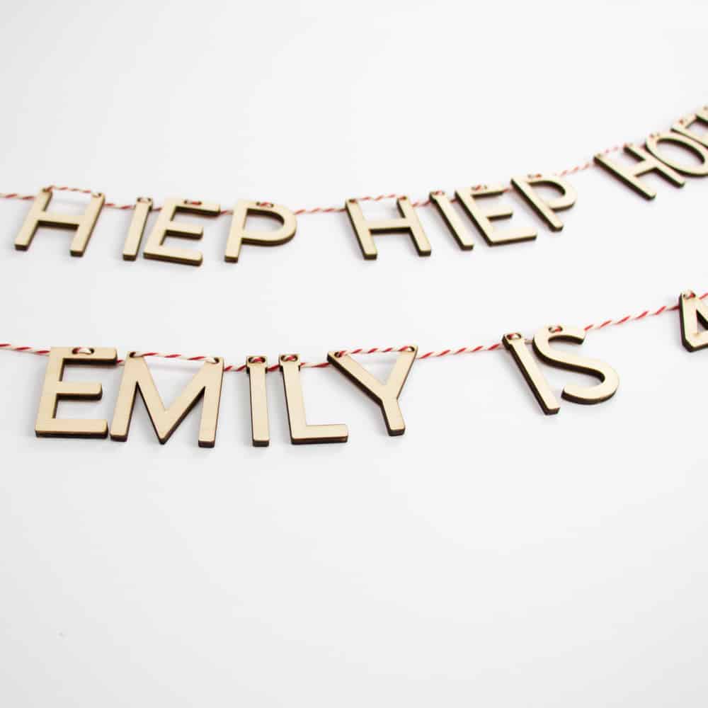 De jarige ontvangt de tekst ‘Hiep Hiep Hoera … is … jaar’ of “Hiep Hiep Hoera … is jarig’ in houten letters van 4 cm hoog. En voor de puntjes vullen we de naam en/of de leeftijd in die jij aan ons laat weten.