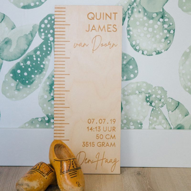 Een Houten Geboorte Meetlat als een mooie herinnering aan de geboorte van je kindje.
